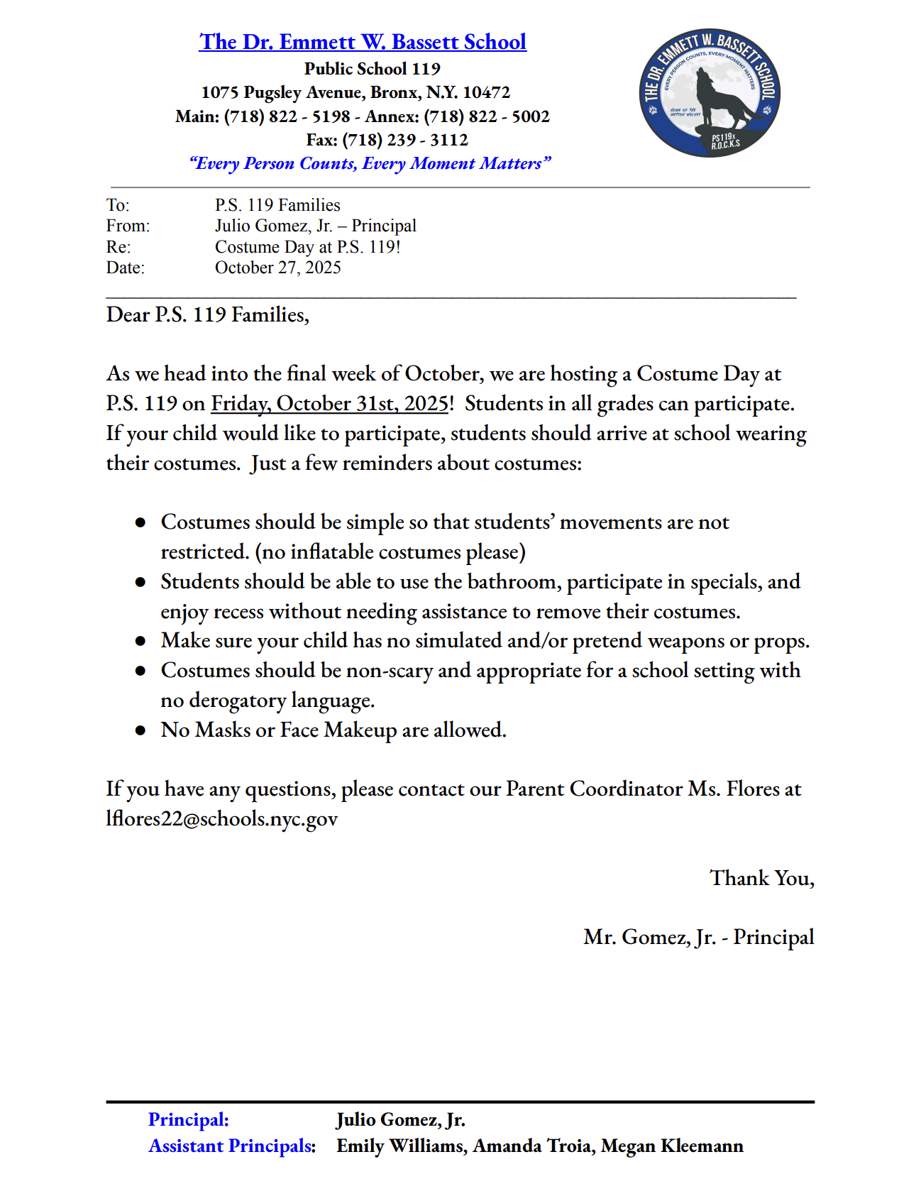 As we head into the final week of October, we are hosting a Costume Day at P.S. 119 on Friday, October 31st, 2025! Students in all grades can participate. If your child would like to participate, students should arrive at school wearing their costumes. Just a few reminders about costumes: