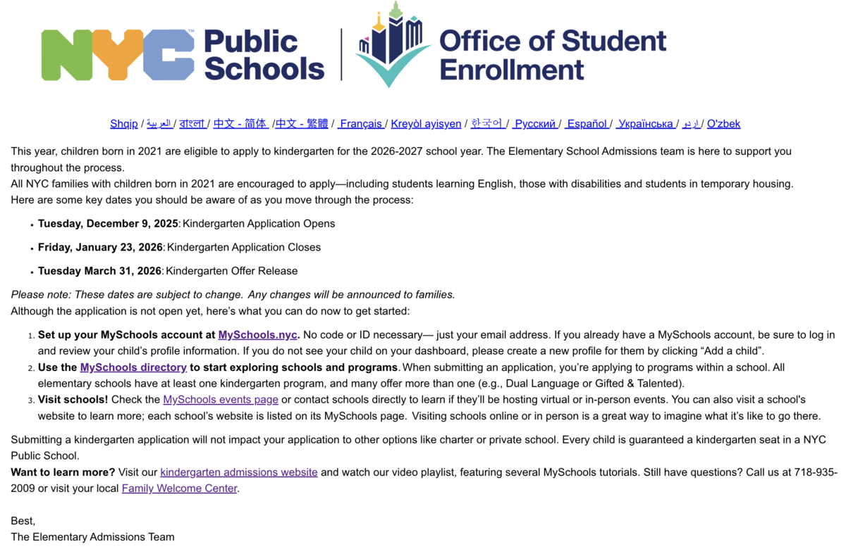 - Tuesday, December 9, 2025: Kindergarten Application Opens
