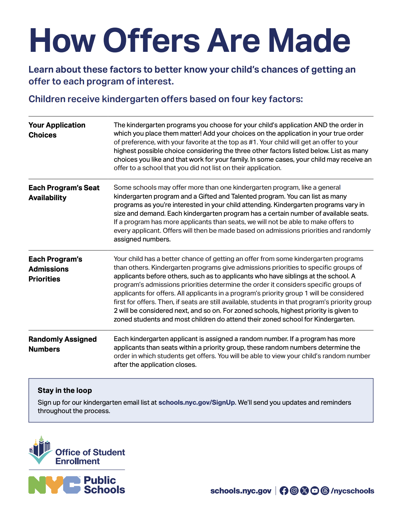| Accept your child's offer by the deadline provided in their offer letter. This secures your child's kindergarten seat at their school. You can accept your offer online through https://www.MySchools.nyc or by containing the school directly. Accepting this offer will not affect your child's chances of receiving a waitlist offer later! |