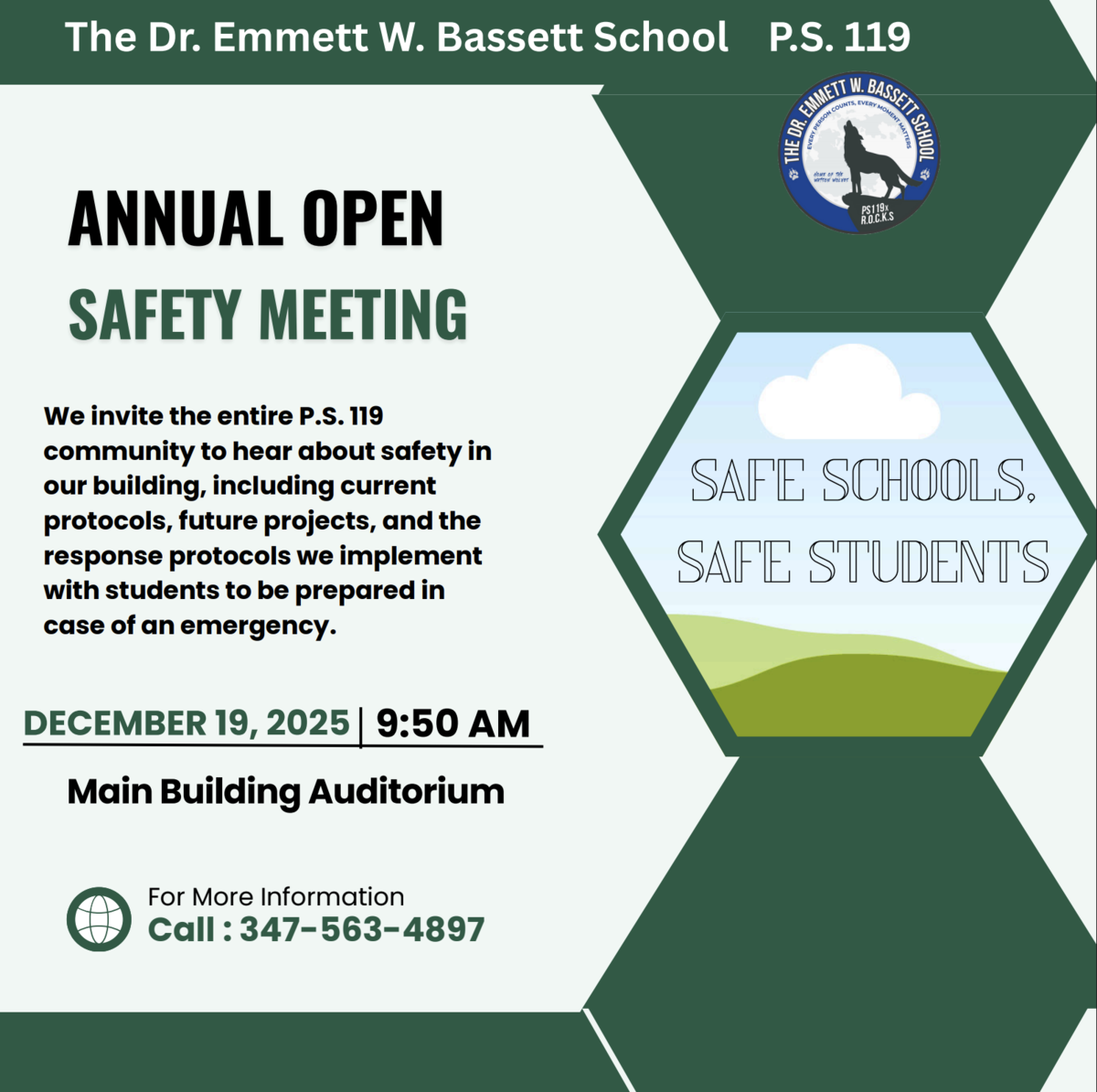 We invite the entire P.S. 119 community to hear about safety in our building, including current protocols, future projects, and the response protocols we implement with students to be prepared in case of an emergency.