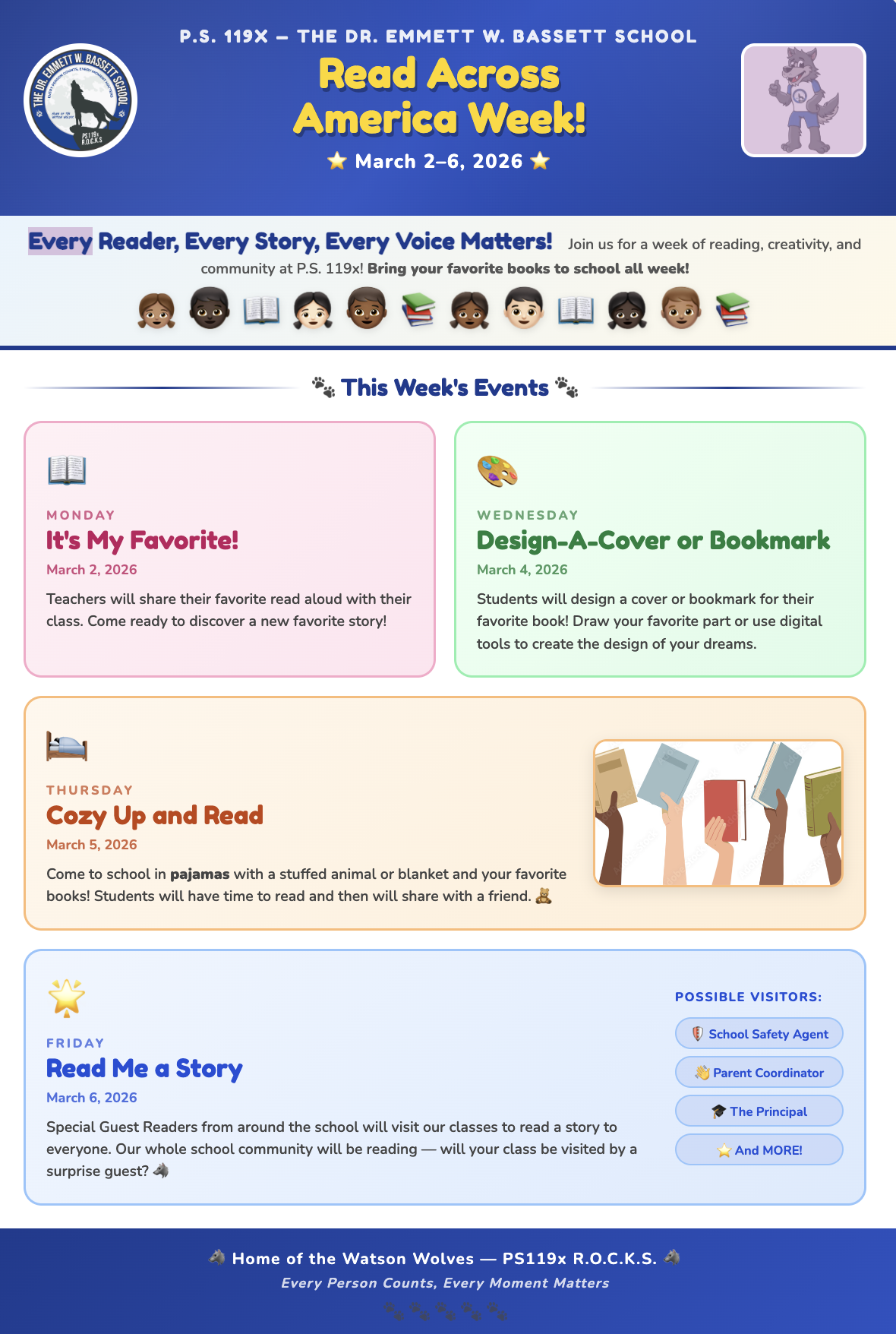 Every Reader, Every Story, Every Voice Matters! Join us for a week of reading, creativity, and community at P.S. 119x! Bring your favorite books to school all week!