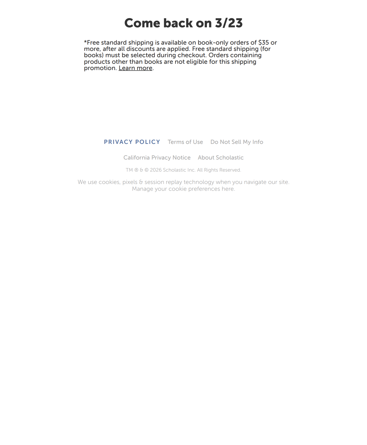 *Free standard shipping is available on book-only orders of $35 or more, after all discounts are applied. Free standard shipping (for books) must be selected during checkout. Orders containing products other than books are not eligible for this shipping promotion.