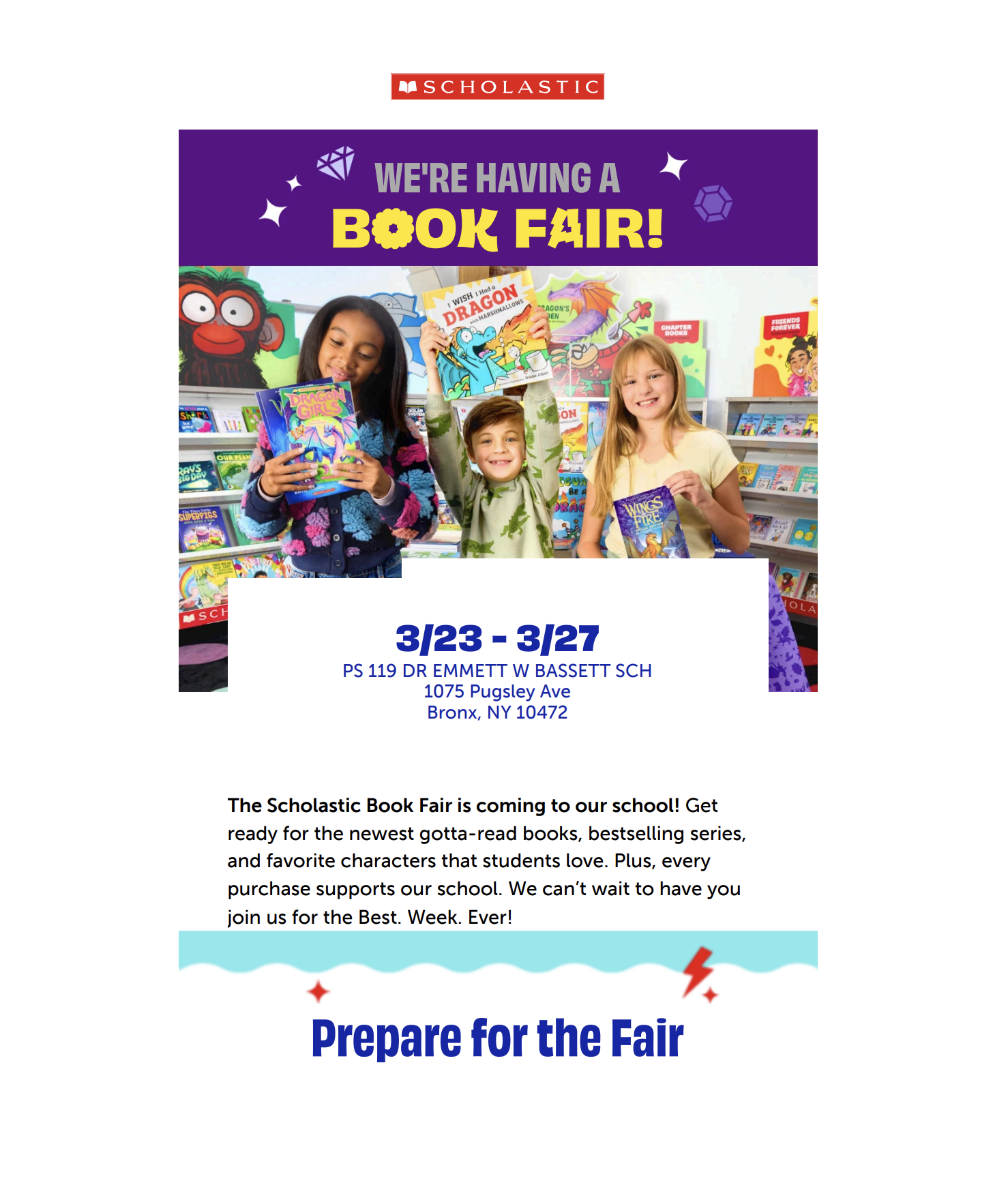 The Scholastic Book Fair is coming to our school! Get ready for the newest gotta-read books, bestselling series, and favorite characters that students love. Plus, every purchase supports our school. We can't wait to have you join us for the Best. Week. Ever!