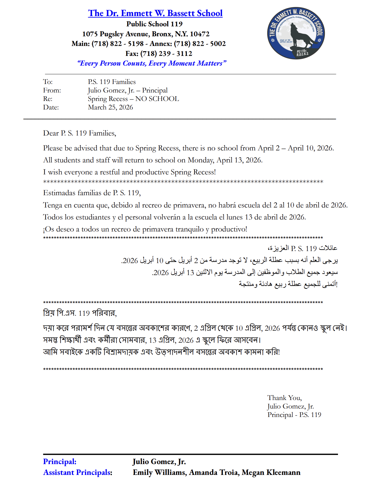 Please be advised that due to Spring Recess, there is no school from April 2 - April 10, 2026. All students and staff will return to school on Monday, April 13, 2026.
